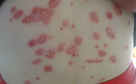 在脓疱型银屑病的初期,红色斑点的形式出现在一个小的颗粒尺寸的无菌表面囊肿伴少量薄鳞片状的皮肤上。脓能迅速上升,合并成大的环状红斑或脓膏,并形成新的病变。由于接触、摩擦等外界因素的影响,常导致脓细胞外破裂,形成糜烂和结痂。