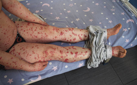1、急性期皮损多呈点滴状,鲜红色, 瘙痒明显。