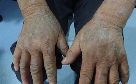 一、手部银屑病一般为边界明显的角化性斑片,其科室较厚,边界较薄,斑上可有点状白色鳞屑或点状凹陷,无皮屑时易与老茧或手部部位角化性皮肤病相混淆,反复摩擦或化学物品刺激,可使损害肥厚扩大,引起手部皲裂。