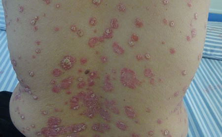 银屑病是一种具有家族遗传性的慢性皮肤病。由于新的皮肤细胞加速,积聚在皮肤表面,增厚皮肤的一部分,形成一个粉红色的鳞片,称为牛皮癣。银屑病常发生在手肘,膝盖,胫骨和头皮,指甲和脚趾甲也会受到影响。大多数病人的症状可以通过健康饮食和皮肤病软膏来控制。